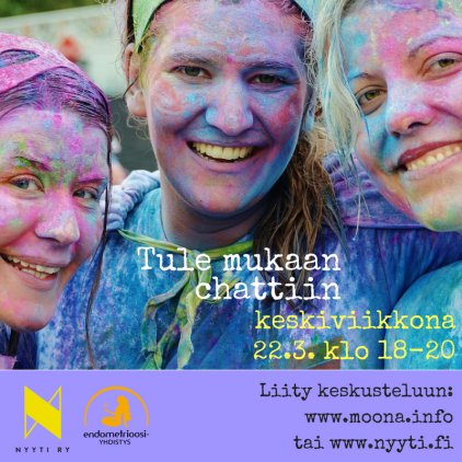 Endometrioosiyhdistys järjestää Nyyti ry:n kanssa yhteistyöchatin Endometrioosiviikolla. Samaan chattiin voi liittyä sivuilla www.moona.info ja www.nyyti.fi. Chat on anonyymi.
